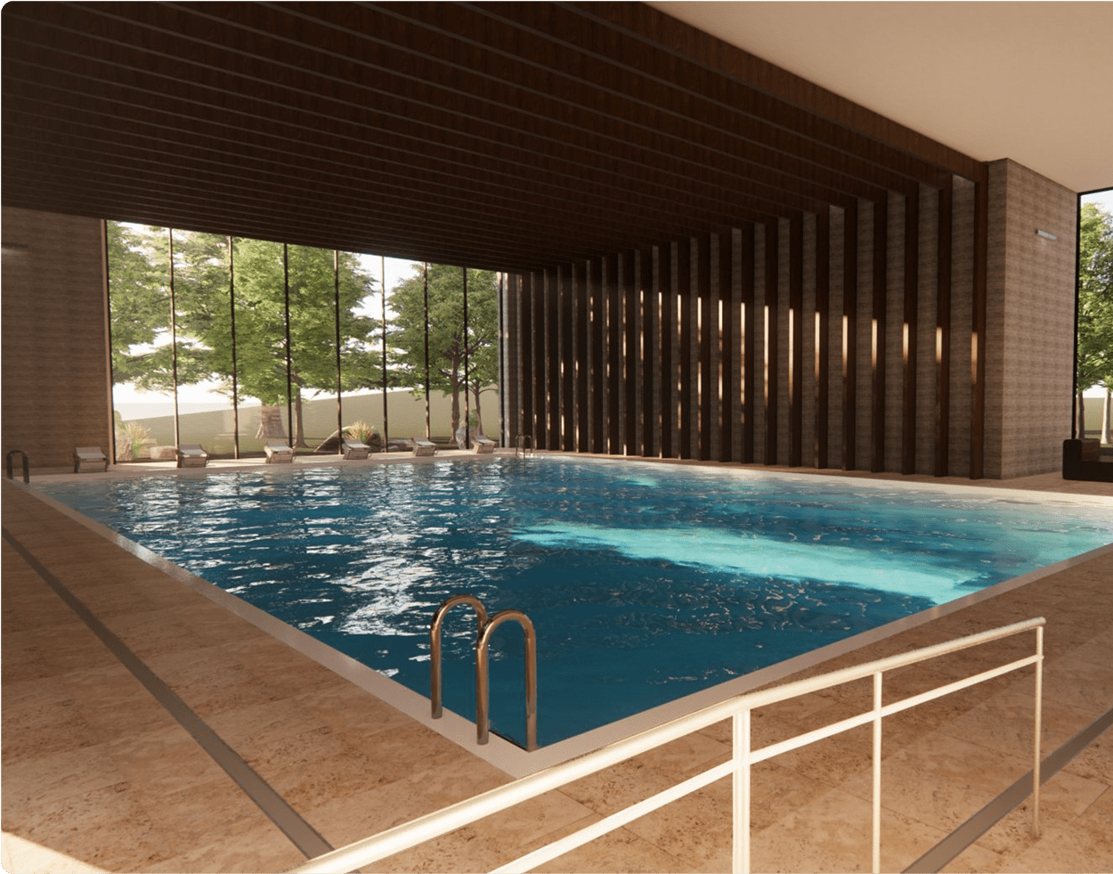 Renovating and updating both areas utilizes Johnston LLC’s interior design and architecture teams together to create more locker and changing space for users, updated private showers and restroom area and a visually stunning pool with textured surround for safety. The client approved a modern, moody theme with wood tones, dark paint and modern flooring.