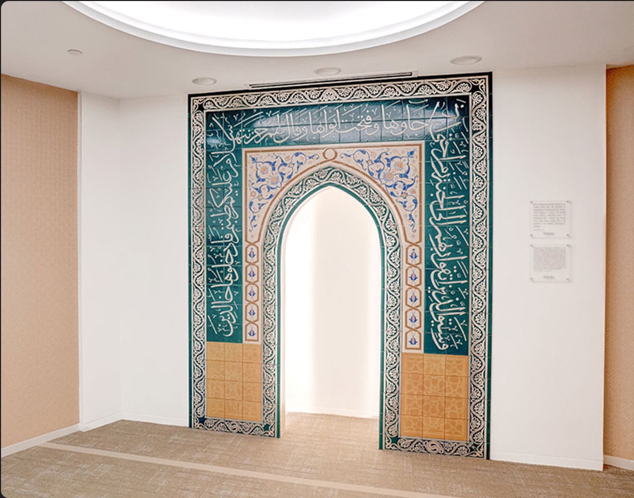 Located on the first floor of the main lobby near the Spiritual Care Offices, the prayer room is open 24 hours a day, offering quiet refuge at any hour. The space is anchored by a custom decorative tile installation at the Mihrab wall, a symbolic element that denotes direction in Islamic prayer. The room is further personalized by original artwork donated by Dr. Khawaja Azimuddin, a respected surgeon at the hospital, whose contribution enhances the emotional and aesthetic experience of the space.
